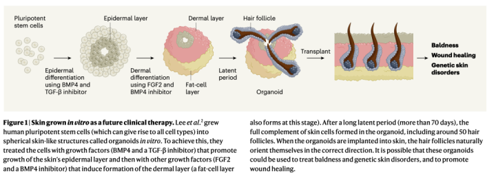 最近哈佛医学院与波士顿儿童医院的研究团带来了新的曙光,他们发在 Nature 的论文显示,通过体外培养人体干细胞,并通过人工干预诱导发育成完整的皮肤,有表皮有真皮,还能形成毛囊并长出毛发,如果顺利发育成头皮,那就能长出货真价实的头发来,救广大头秃人士于苦海之中。