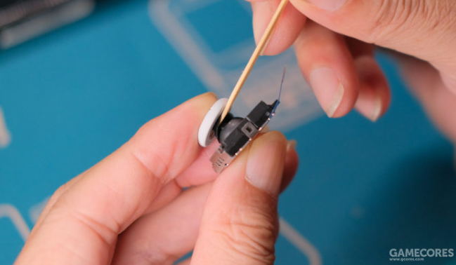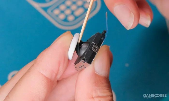 在摇杆蘑菇头的下方有一个软胶防尘罩,只有拿牙签或者别的东西将其挑开,WD-40才能正确的喷进去。不然就会一直在清洁摇杆模块外部而起不到实质作用。
