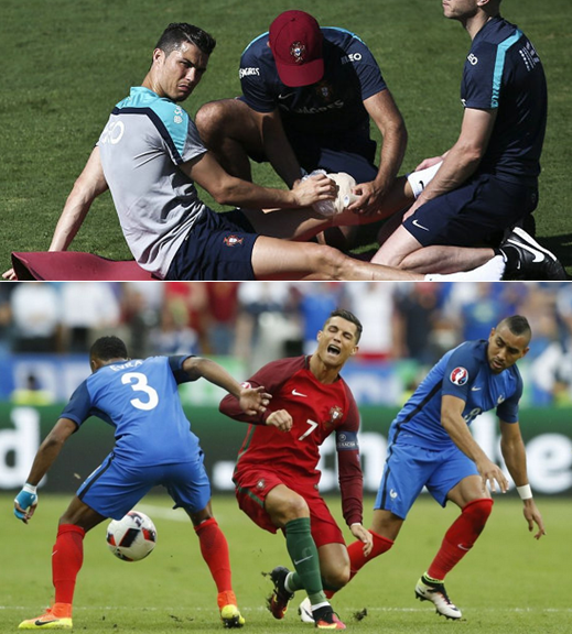 2016年欧洲杯决赛,C罗的左腿膝盖遭受重创,他为此休战了近两个月。C罗在主罚电梯球时需要支撑腿(左腿)完成提拉动作,由于电梯需要的力量很大,支撑腿力量不足是无法达到预期效果的。