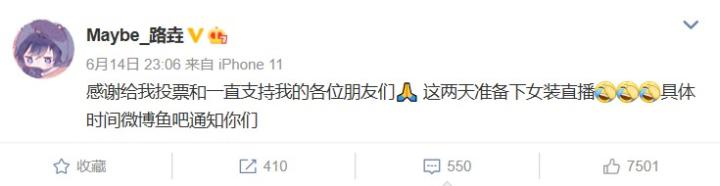 在前几次的评选中,评选结果可以说是非常酸爽,这次真的十分令人解气。当然为了庆祝这次当选,Maybe也是兑现自己的承诺,在今天的直播中开启女装直播。