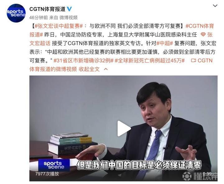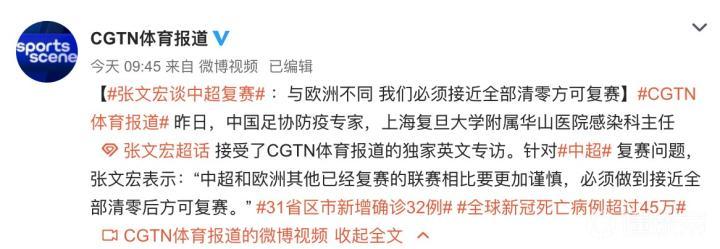 国内著名防疫专家张文宏在接受CGTN的采访时表示,中超复赛相比欧洲联赛要更加谨慎,因为在中国目标是病例清零,只有病例接近清零才能复赛。