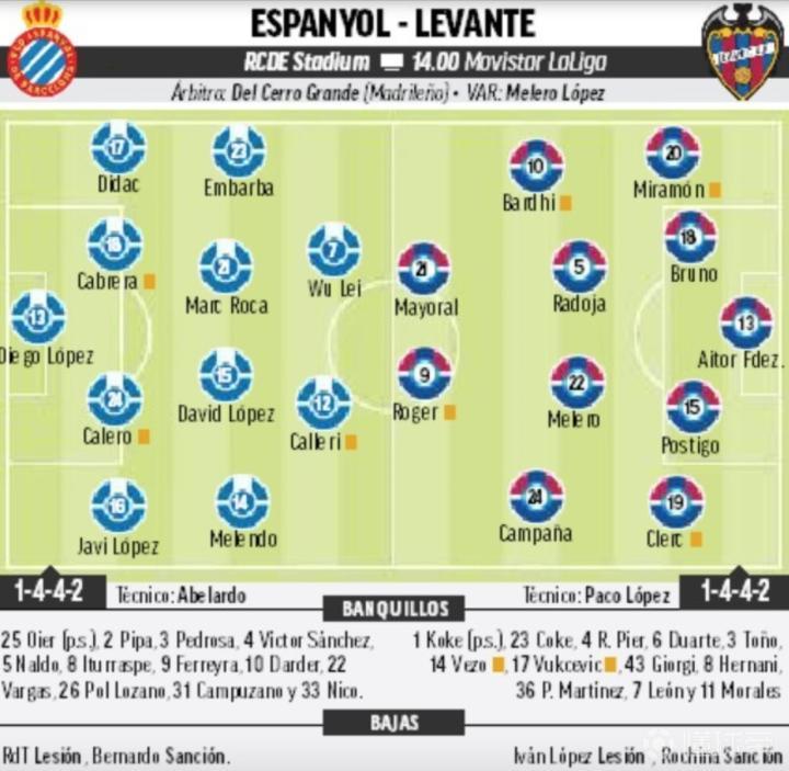 北京时间今晚20:00,西班牙人将在西甲第30轮主场迎战莱万特,赛前《马卡报》预测了他们的首发阵容,武磊出战。
