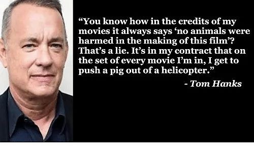 “你知道我的电影总是如何说‘这部电影的制作中没有动物受到伤害’吗?这是一个谎言。根据我的合同,在我参加的每部电影中,我都会把一头猪从直升机中推出去。”