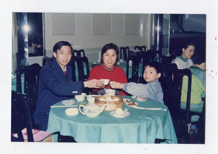 1992年,一家三口在长沙玉楼东饭店“下馆子”。