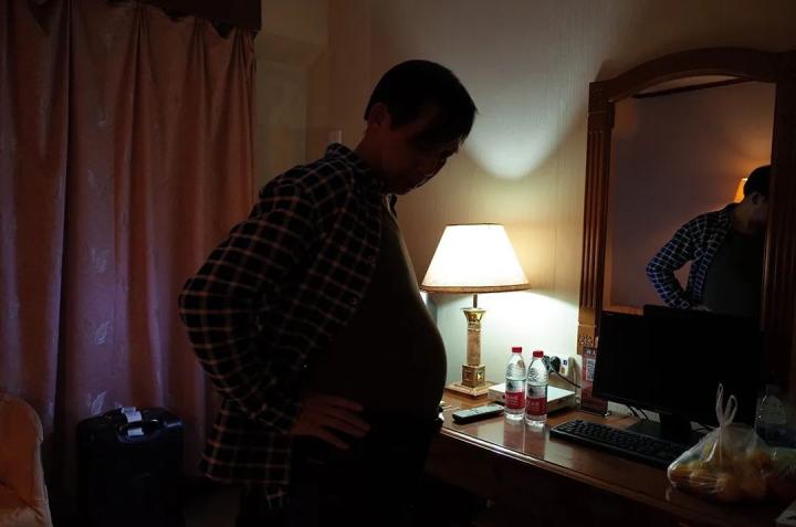 2017年,哈尔滨,爸爸烦恼他日益增长的腰围。