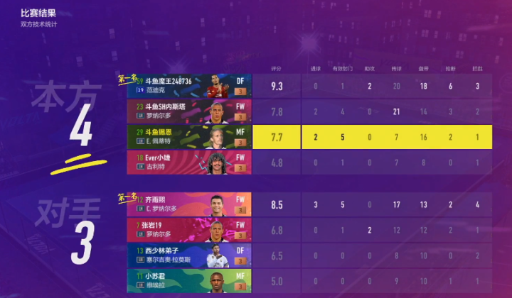 比赛结束,斗鱼主播队最终4比3战胜苏宁主播队,斗鱼主播队的斗鱼魔王248736以评价分9.3分获得MVP!