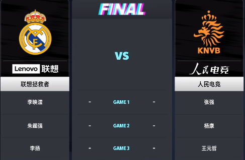 第一场比赛,联想拯救者战队派出联想拯救者映云对战人民电竞战队的人民电竞贝多芬。 第19分钟人民电竞贝多芬后场出现失误,贝尔迎球怒射,皇马1比0领先!上半场结束,联想拯救者映云1比0领先人民电竞贝多芬,第79分钟,卡塞米罗中路挑传找到C罗纳尔多,C罗迎球怒射,范德萨鞭长莫及,皇马2比0领先!第87分钟,德佩回做给里杰卡尔德,里杰卡尔德大禁区外一步搓射,皮球击中立柱弹出!最终联想拯救者映云2比0战胜人民电竞贝多芬,在决赛中先拔头筹!