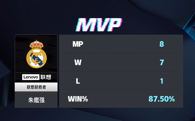本届比赛最终MVP颁给了联想拯救者战队的联想拯救者jc,出战8场,取得7胜1负的成绩,胜率87.5%。打进18球,仅失6球!带领联想拯救者战队获得冠军荣耀!