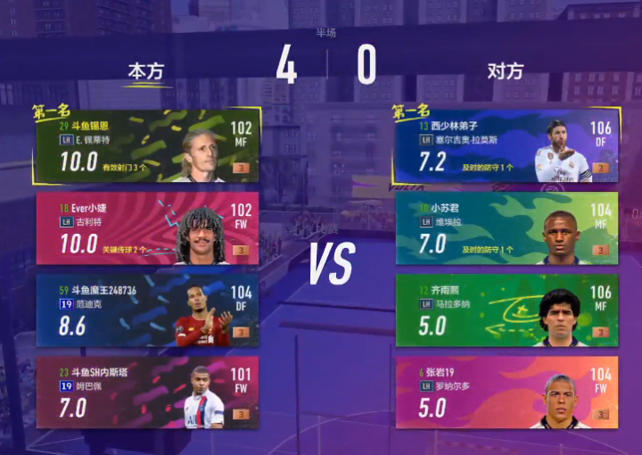 半场战罢,斗鱼主播队4比0领先佩蒂特和古利特都以10分满分领衔!