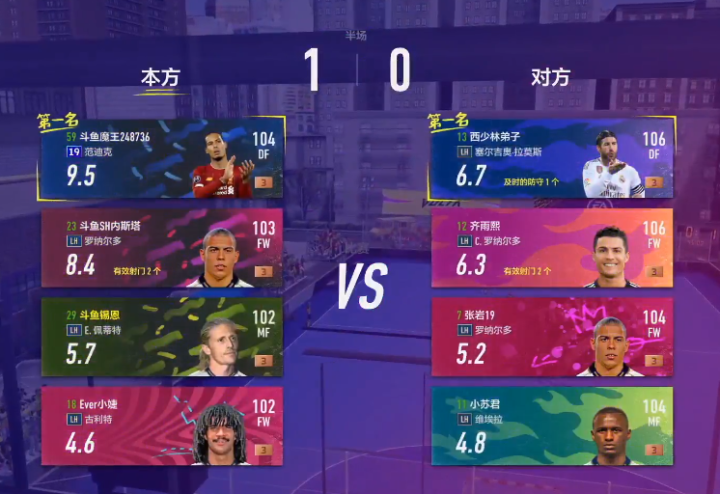 半场结束,斗鱼主播队1比0领先,19欧冠范迪克9.5分暂为MVP!