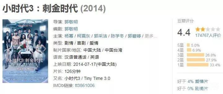 《小时代》四部曲评分最低一部,《小时代3:刺金时代》评分4.4。