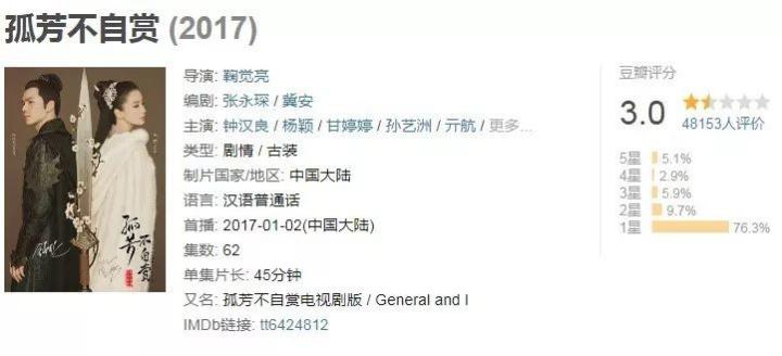 虽然是电视剧,但因野生抠图被全网嘲讽的《孤芳不自赏》,也硬是凭着扣在断崖边的最后几根手指,而挂在了3分线上。