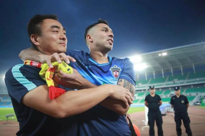 对中优赛后,他搂着广州富力队工作人员