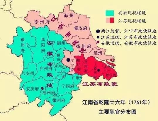 江宁巡抚辖区(苏南)最有钱,如果该地再有充足人口,那造反的条件就具备了。为了避免出现这种情况, 1661年顺治皇帝又将江南省分割成两部分,东称“江南右布政使司”,管理现在苏南一带,办公地点在苏州;西称“江南左布政使司”,管辖现在的苏北和安徽大部,布政使的办公地点却在南京。这个布政使在清朝管辖一个省的民政,相当于常务副省长。