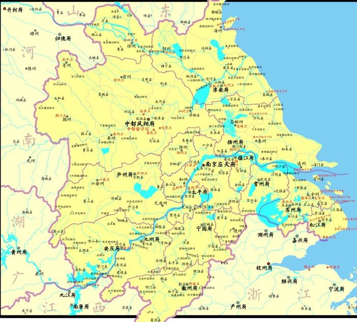 另外,中央的权力也需要维护,需要有个地方征税、征兵,于是明朝将南京城以及其周边的17府统一划归为中央管辖。这18府统称为南直隶,现在的江苏、安徽和上海都属于南直隶。