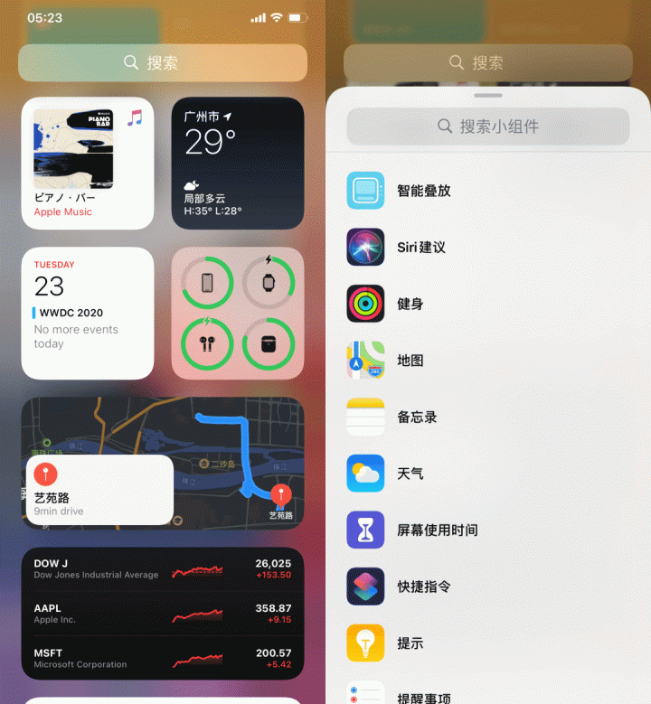 另外,iOS 14 还为小部件加入了「叠放」功能,顾名思义,就是将多个组件做堆叠处理,然后靠上下滑动来切换。