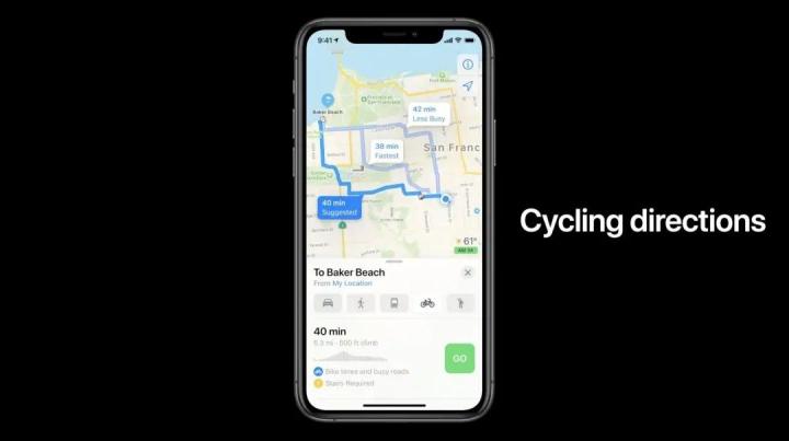 另外,苹果地图还推出了新的出行模式。比如说在你骑车时,就可以切换成骑行模式,此时地图会自动提供自行车道路线、海拔等信息,并让你避开拥堵路段。