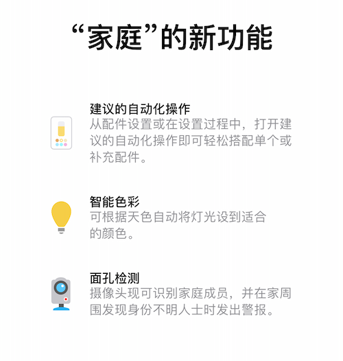 另外,家庭还引入了「自适应光照调节」功能,让照明设备能自动根据光照和时间段,调整灯泡色温。