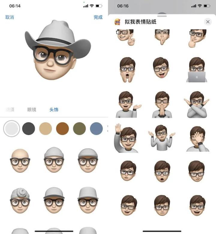 就像苹果所演示的那样,新的 Memoji 头像加入更多可定制的细节,包括 6 个新的年龄段,7 个新发型,16 种新头饰,以及 3 个新的 Memoji 贴纸表情。