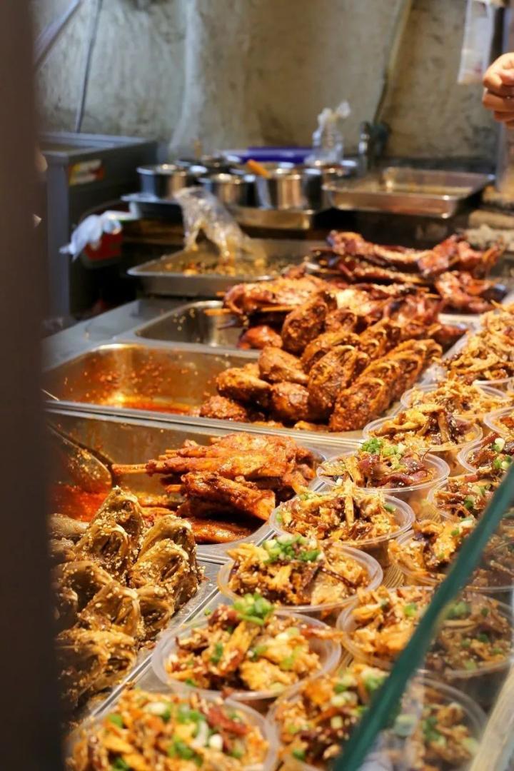 事先把食材都煮熟,再往店家秘制调料里浸泡就行,泡一泡,食材就能吸饱麻辣鲜香的浓郁酱汁,蘸取少许干碟,便可开吃。