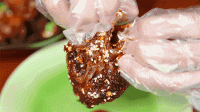 吮吸表面的肉,再沿着嘴角处的上下颚撕开,把兔头一分为二,然后尽情地吮吸里面鲜辣多汁的兔脑花。