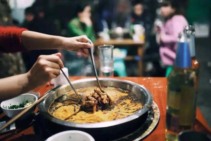 当红油滚开,热气氤氲,筷子不停,席间吆喝声不停,餐桌上皆是油锅里低落的红斑点点。