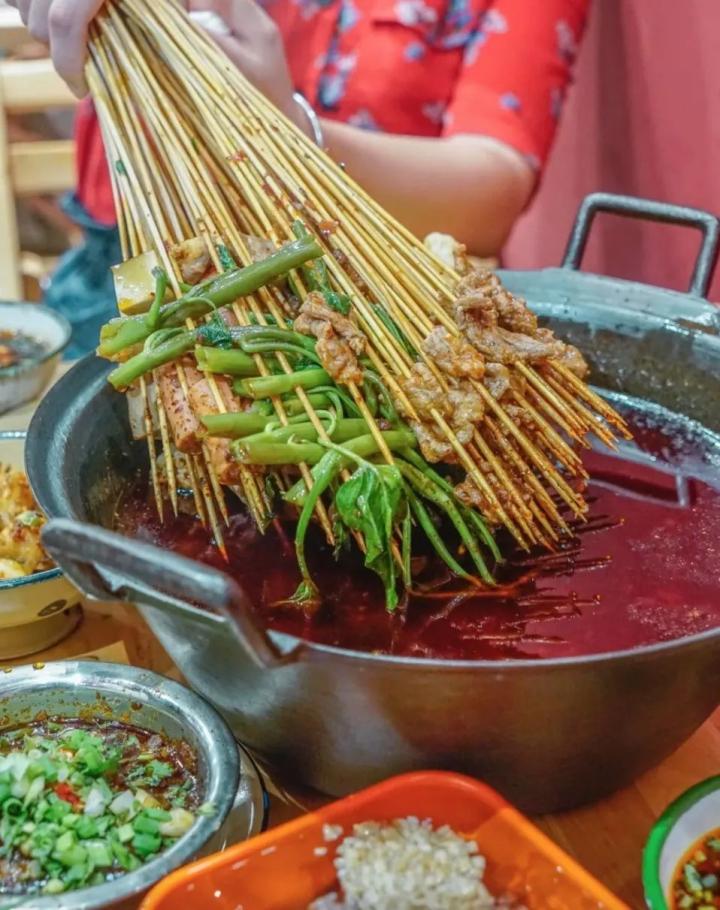 重庆人把提前腌制好的新鲜生料串在竹签上,当成火锅菜一样放到火锅里边烫边吃。