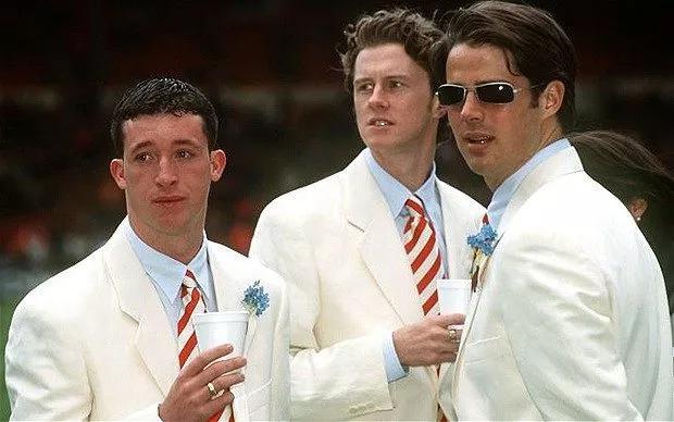 1996年足总杯,红军和红魔会师决赛上演双红会,而在决赛前,本是阿玛尼代言人的红军门将詹姆斯给红军将士拉来了阿玛尼的赞助,让他们在决赛前都穿着奶白色西装和红白相间的领带登场,俨然一副偶像出道的即时感。