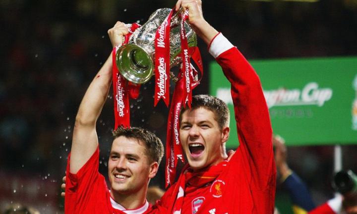 (图)杰拉德和欧文一起捧起联赛杯冠军奖杯