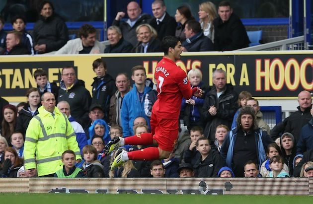 (图)默西塞德德比进球后,苏亚雷斯用跳水式庆祝回击莫耶斯的批评