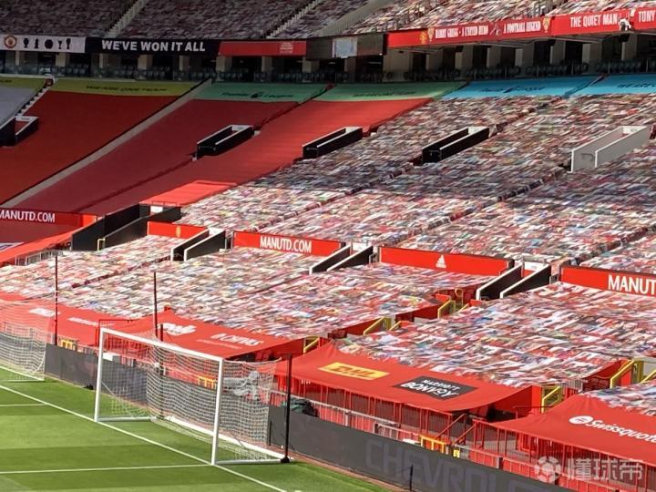 从这张随队记者由现场拍到的图片来看,曼联在主场看台上设置了使用巨幅海报印刷的“虚拟球迷”,看起来就像是一幅幅巨大的立绘。不过由于“球迷们”被平铺在球场看台上,显得没有立体感,整体也比较杂乱。