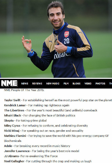 在英国著名音乐杂志NME(The New Musical Express)评选的年度人物中,弗拉米尼成功入选。看图说话,跟他一起入选的还包括著名歌星斯威夫特、麻辣鸡、阿黛尔和著名影星詹妮弗-劳伦斯。