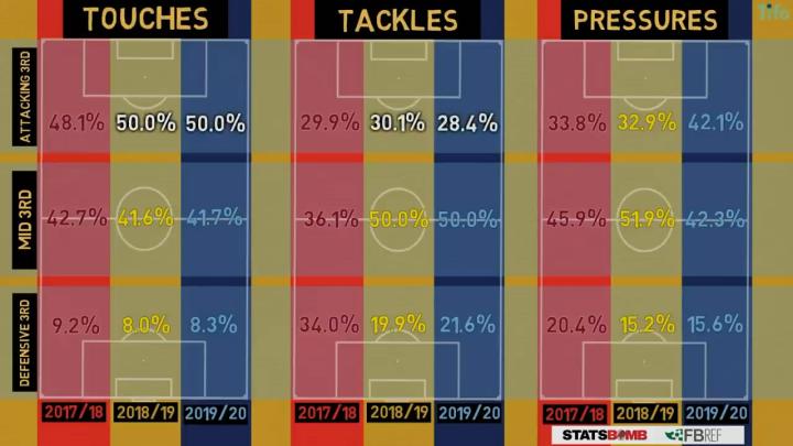但他所控制的球场区域已经发生了微妙的变化,虽然他的触球和抢断区域在过去两个赛季中相对稳定,在这个赛季,他在前场的压迫力度更大。德布劳内的位置和防守工作随着球队的变化而变化。