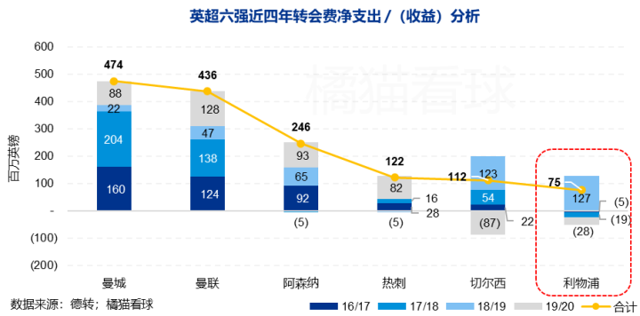 ——球员注册权原值,衡量阵容构建成本最准确的数字,18/19赛季末为6.5亿英镑,远低于曼城的9亿、切尔西的8.7亿以及曼联的7.7亿,阵容市值却高达8.8亿,增值35%。