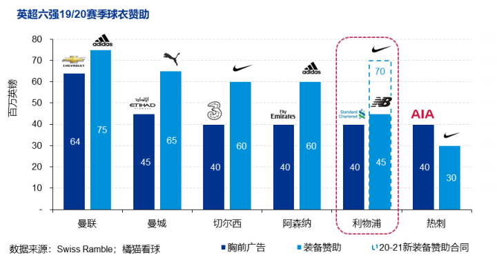 在此基础上,下赛季新百伦的赞助合同将被耐克取代。据媒体报道,这份合同设定了每年3,000万英镑+球衣销售提成20%+冠军奖金的赞助费结构,预计实际年赞助额将在6,000-8,000万,在极度乐观的情况下甚至可以达到近亿英镑。