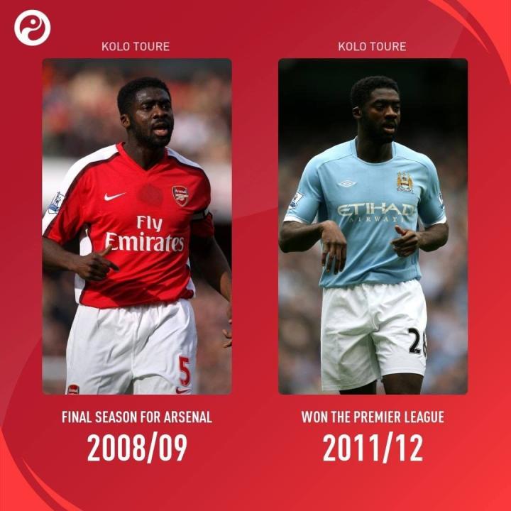 2009年夏天,作为枪手又一位03/04赛季夺冠主力球员,科洛-图雷离队加盟曼城,并在2011/12赛季跟随曼城夺得个人职业生涯第二座英超冠军。而当时曼城的冠军成员中,除了科洛-图雷外,还有另外两名枪手旧将,他们是在2011年夏天前后脚离开酋长球场并一同加盟曼城的克利希和纳斯里。