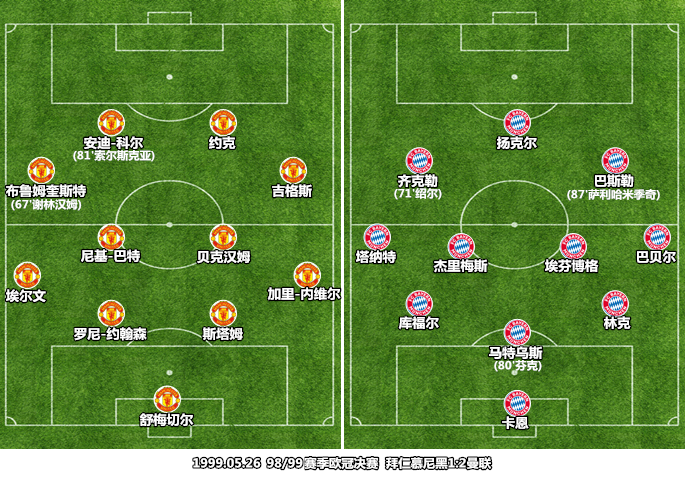 (图)99年欧冠决赛,斯科尔斯和基恩缺阵,贝克汉姆移镇中路,布鲁姆奎斯特与吉格斯两翼齐飞。