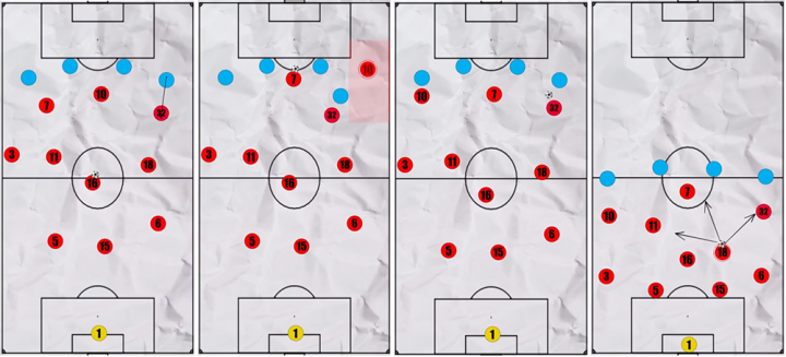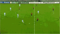 当鲁尼来到右边路持球时,C罗和特维斯会向他靠拢,形成一个局部的三角传递网络,另一侧放空的边路由左中场吉格斯填补,形成一个短暂的“两翼齐飞”格局。在一般的433体系中,进攻型中场很难起到边锋的作用,吉格斯则完全不存在这样的问题。