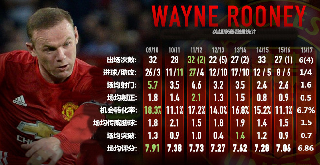 2011/12赛季,鲁尼开始逐渐向中场转型,场均传球数接近于50次,在队内仅次于卡里克,他的数据固然华丽,但为球队做出的牺牲也是不容低估。