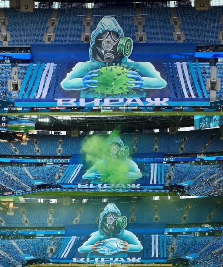 6月26日,俄罗斯足球联赛泽尼特的激进球迷组织在球场展示出巨型TIFO,穿着生化服的人物一把捏爆了病毒,把足球展示给了整个球场,以及守候在电视机、电脑前的全世界球迷: