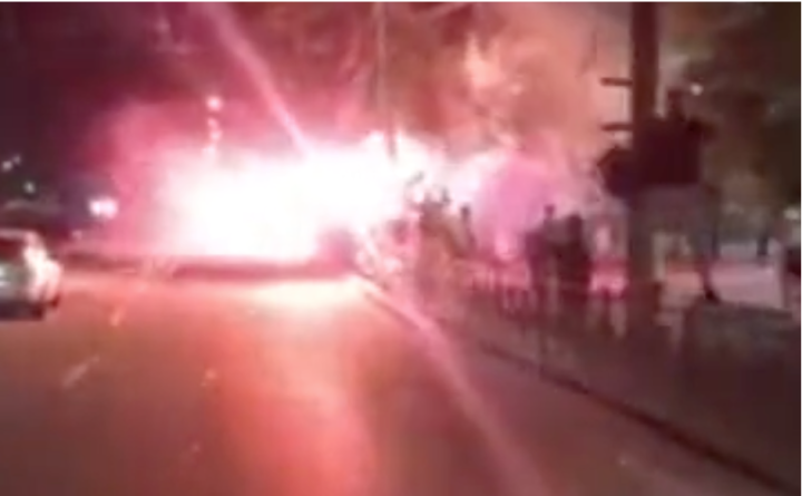 大巴司机不断地用喇叭回应着球迷的声浪,最终还是停在了路边。