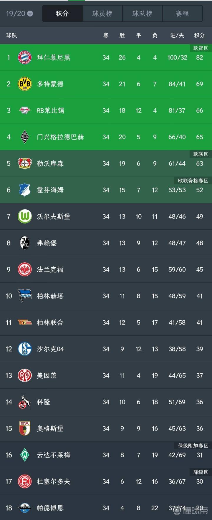 本赛季德甲最终积分榜