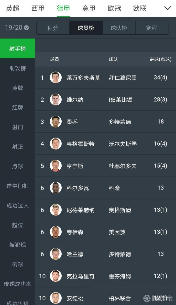 德甲射手榜