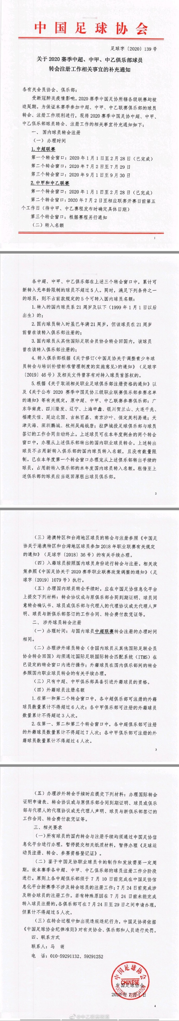 中国足协下发《关于2020赛季中超、中甲、中乙俱乐部球员转会注册工作相关事宜的补充通知》,告知了中超、中甲、中乙联赛本赛季的第二个、第三个转会窗口时间。其中,中超第一个转会窗口已于1月1日-2月28日完成。第二个转会窗口定于7月2日-7月29日;第三个转会窗口定于9月1日-9月30日。