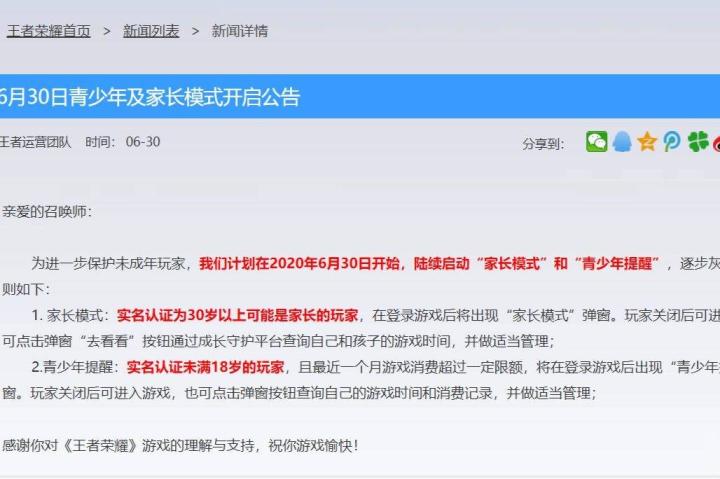 6月30日,王者荣耀官方运营团队发布了青少年以及家长模式开启公告。