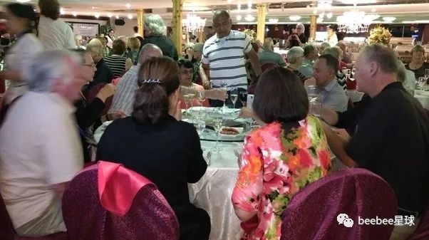 相比美式长桌,人们吃得有限还各聊各的,老太太在镜头前露出了尴尬的笑脸