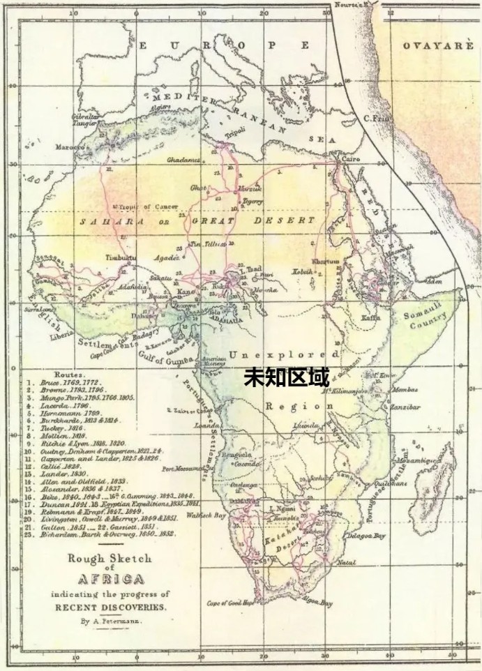 ▲1853年地图上的非洲大陆中央还显示为未探索区域