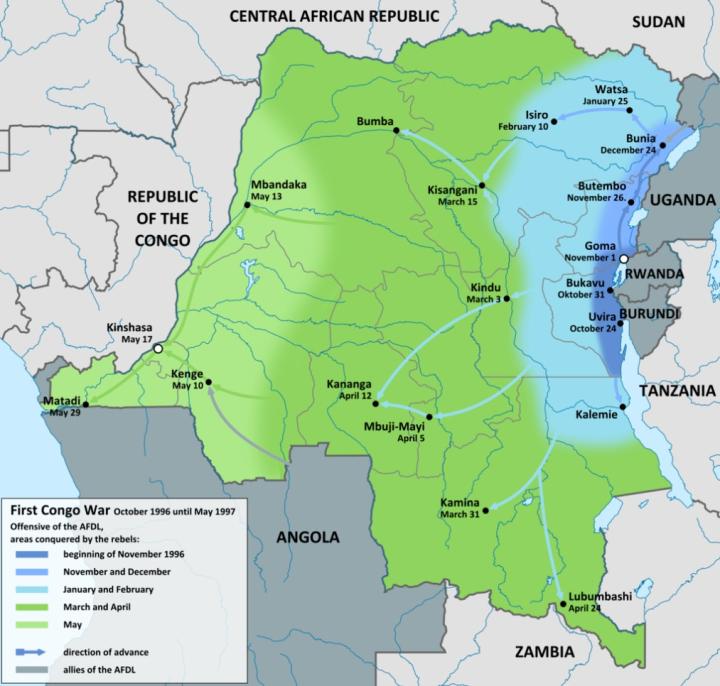 ▲导致蒙博托的统治被推翻的“第一次刚果战争”,叛军获得东边邻国的支持