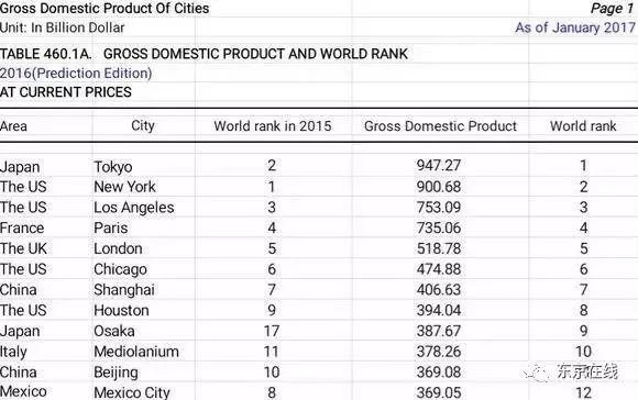 ▲2016年全球城市GDP排名,东京一度冲上第一名的宝座