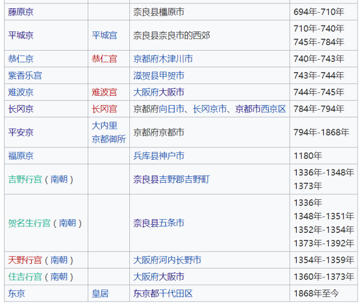 ▲自藤原京时代起,历代皇居所在地。除了东京以外,其余均是在关西地区
